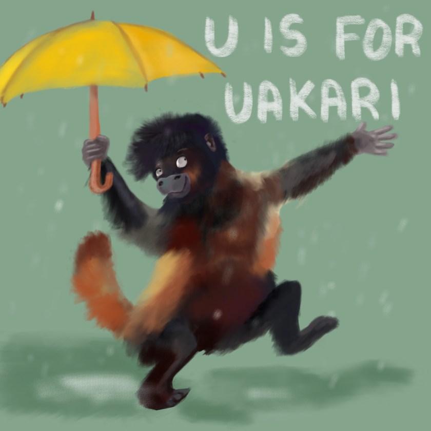 #uakari #primate #rainforest #rain #umbrella #dancing #animal #mammal #alphabet #book #childrens illustration #illustrator #illustration #illustrate #drawing #doodle #sketch