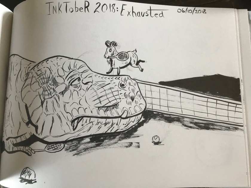 #jurassic Park #dinosaurs #t Rex #goat #tennis #ink #brush pen #inktober #inktober 2018 #cute #fun #funny #silly #lol #exhausted #ink #traditional art #comic #bam bofu #illustration #illustrator #drawing #doodle #sketch