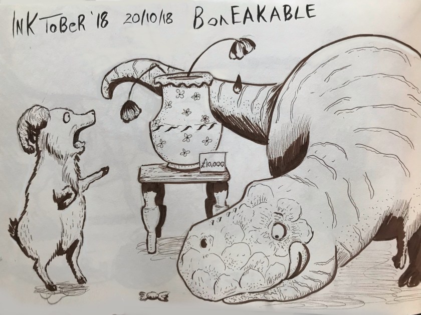 #breakable #inktober #inktober 2018 #ink #doodle #drawing #sketch #study #illustration #ink #sepia #dinosaur #trex #goat #vase #flowers #table #fragile #break #bam bofu