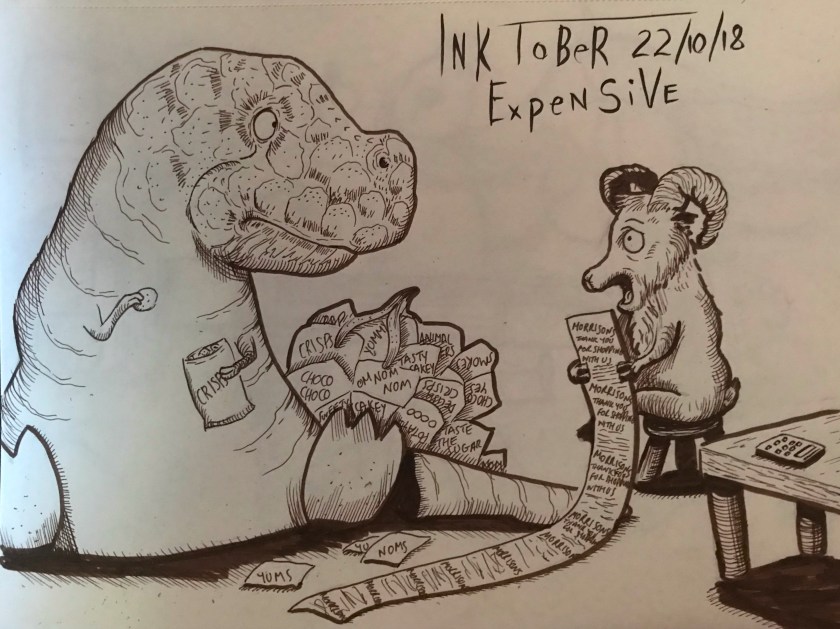 #t Rex #dinosaur #crisps #shopping #bills #fun #funny #silly #cute #lol #goat #food #expensive #ink #doodle #drawing #sketch #illustration #inktober #inktober 2018