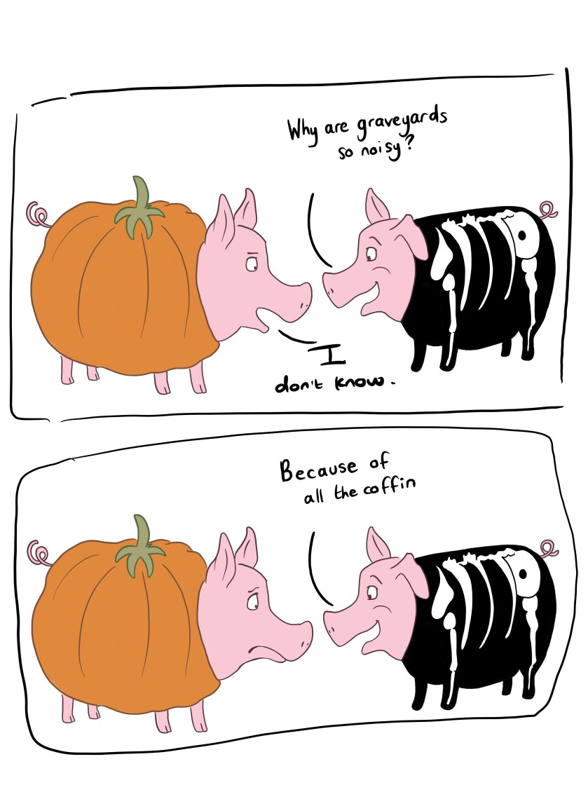 #funny #halloween #halloween jokes #pigs #sheep #teapot #ghost #costume #skeleton #pumpkin #werewolf #vampire #silly #cute #lol #drawing #doodle #illustration #sketch #bam Bofu