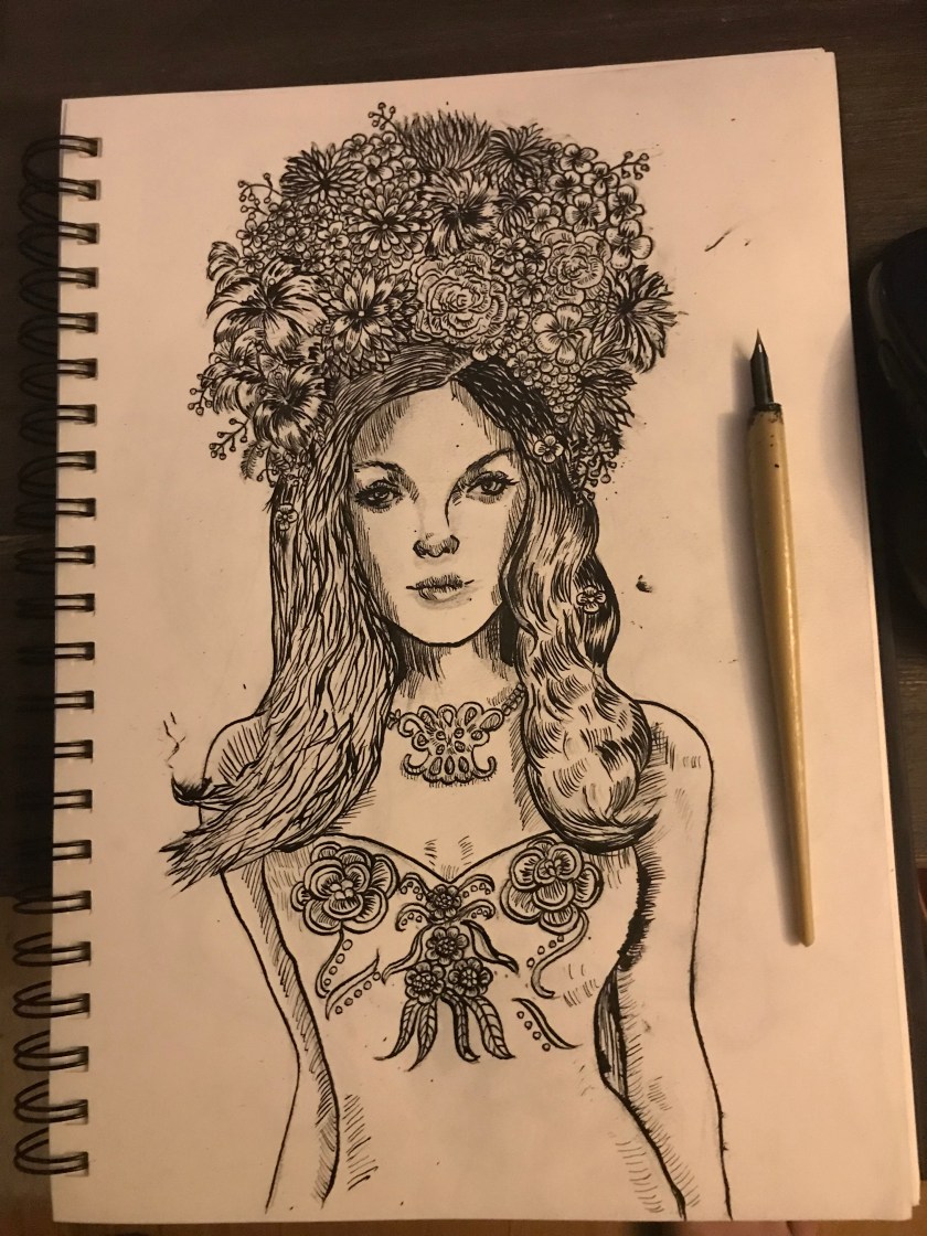 #illustration #dip pen #ink #ink portrait #ink flowers #flowers #study #illustration #portrait #sketchbook #doodle #drawing #artists on Instagram #artist #bam Bofu